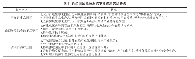 園區在推動我國實體經濟發展和城鎮化發展中發揮了關鍵作用,是支撐制造強國戰略的主戰場。有研究表明,園區二氧化碳排放量約占全國總排放量的31%[4],園區是資源能源消耗最集中的地方?,F階段,為了節約能源,保護環境,我國各級園區都在持續推動綠色低碳發展。田金平等研究指出我國工業園區節能提效實踐創新主要體現在以下5個方面: ①聚焦重點領域,全過程系統性推進節能工作。②集中式能源基礎設施升級改造,多樣化開發利用余熱、 余壓和能量多級利用。③積極利用可再生能源,推進能源結構轉型升級。④積極開展智慧能源探索,實現能源全過程精細化管理。⑤建立健全能源管理體系。表1為典型園區能源系統節能提效實踐特點。