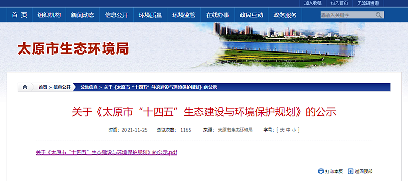 近日,太原市生態(tài)環(huán)境局在其官網(wǎng)發(fā)布了關(guān)于《太原市“十四五”生態(tài)建設(shè)與環(huán)境保護(hù)規(guī)劃》(下文簡稱《規(guī)劃》)的公示。