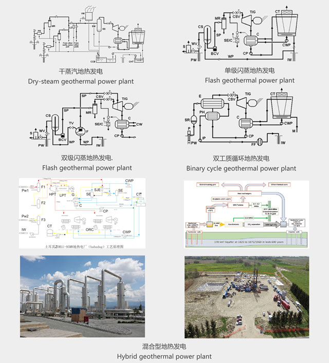 地?zé)岚l(fā)電需根據(jù)地熱流體的溫度、壓力以及它們的水、汽品質(zhì)的不同而采取不同的設(shè)計(jì)方案。其主要類(lèi)型包括:干蒸汽地?zé)岚l(fā)電、單級(jí)閃蒸地?zé)岚l(fā)電、雙級(jí)閃蒸地?zé)岚l(fā)電、一井一站地?zé)岚l(fā)電、混合型地?zé)岚l(fā)電、雙工質(zhì)循環(huán)地?zé)岚l(fā)電、干熱巖發(fā)電。