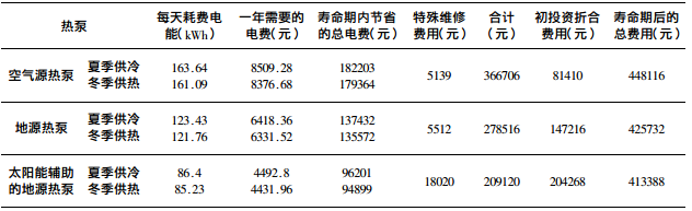 實際運行中,熱泵的運行費用主要體現在它對電能的消耗。由于土壤熱源熱泵性能系數高,所以比風冷熱泵節省了電能耗。因而雖然土壤熱源熱泵比風冷熱泵的初投資高,但是它的運行費用卻比風冷熱泵要低。
