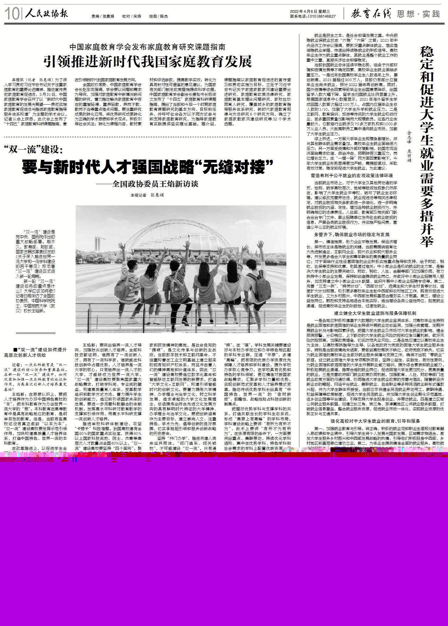 王焰新:要突出培養(yǎng)一流人才導(dǎo)向,加強拔尖創(chuàng)新人才培養(yǎng)。全部科技史都證明,誰擁有了一流創(chuàng)新人才、擁有了一流科學(xué)家,誰就能在科技創(chuàng)新中占據(jù)優(yōu)勢。人才培養(yǎng)是一流大學(xué)的核心,只有培養(yǎng)出一流人才的大學(xué),才能夠成為世界一流大學(xué)。“雙一流”建設(shè)高校要聚焦國家重大戰(zhàn)略需求,打破學(xué)科間、專業(yè)間的壁壘,構(gòu)建高質(zhì)量育人體系,變革教學(xué)組織和教學(xué)方式方法,著力提升學(xué)生的創(chuàng)新能力,適應(yīng)和引領(lǐng)國家未來的發(fā)展。要進一步完善科教融合的體制機制,發(fā)揮高水平科研對教育教學(xué)的支撐和引領(lǐng)作用,用高水平科研支撐一流創(chuàng)新人才培養(yǎng)。